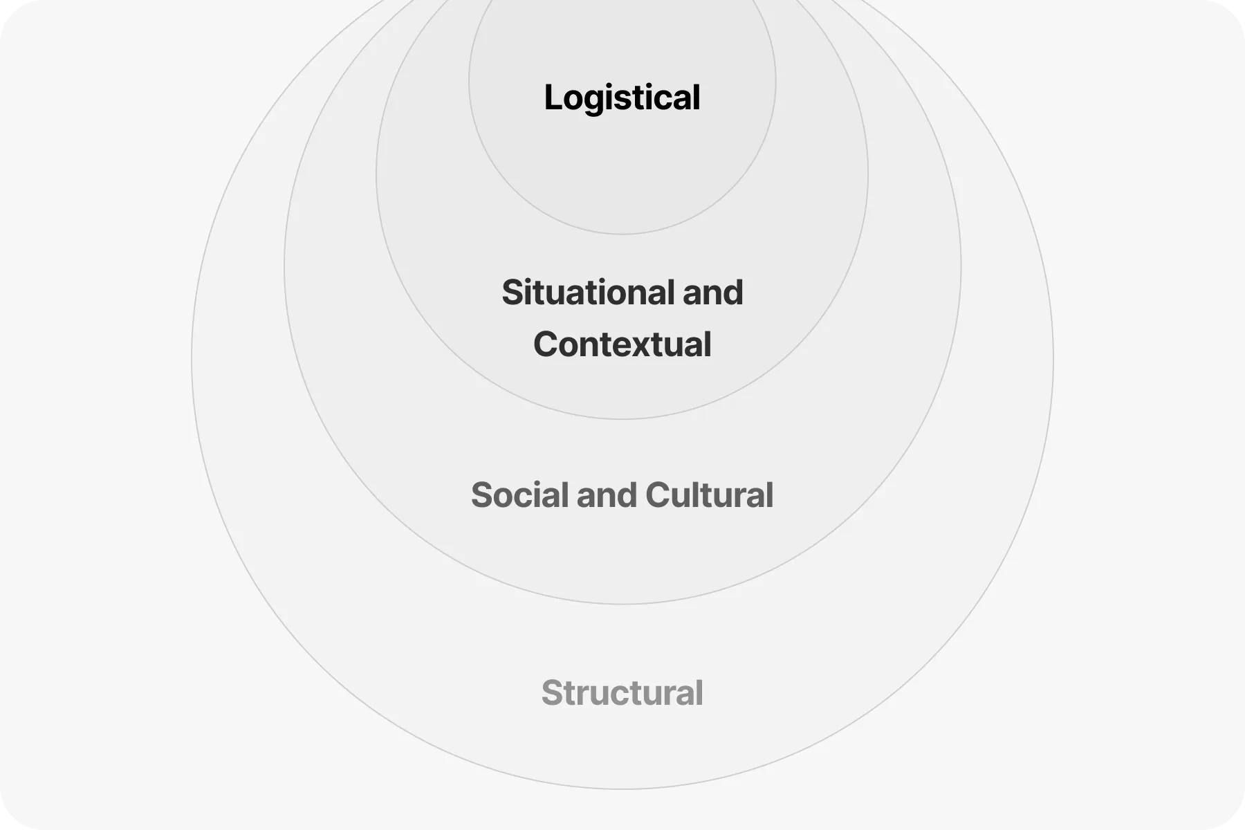 The environment refers to a multitude of contextual factors that can reduce or amplify barriers of the persons. They operate at different scales, from the logistical (usually frictions by design), the situation (e.g., contextual factors that create a sense of urgency), to social and cultural context (e.g., the behaviour might be against the social norm) as well as the wider systemic structural barriers (like market structures, government or industry regulations, and infrastructure).