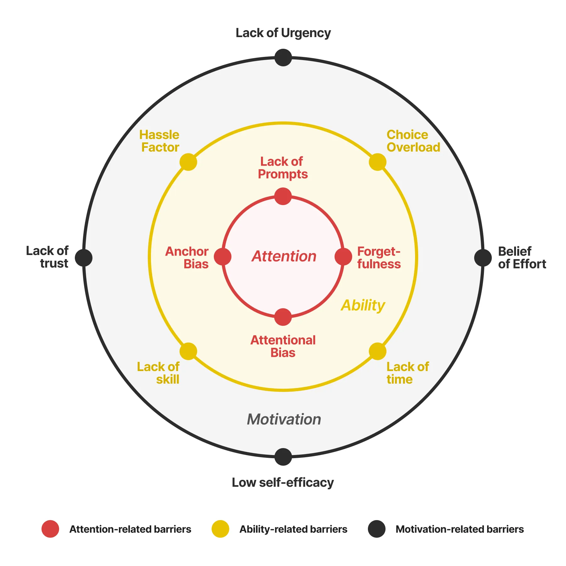 Physical barriers refer to barriers such as lack of energy, lack of skills or capabilities. Psychological barriers refer to a multitude of factors, from having to think and/or make a decision (the more complex the decision, the bigger the barrier) to all the biases, heuristics, beliefs and motivational drives that influence our choices and behaviours.