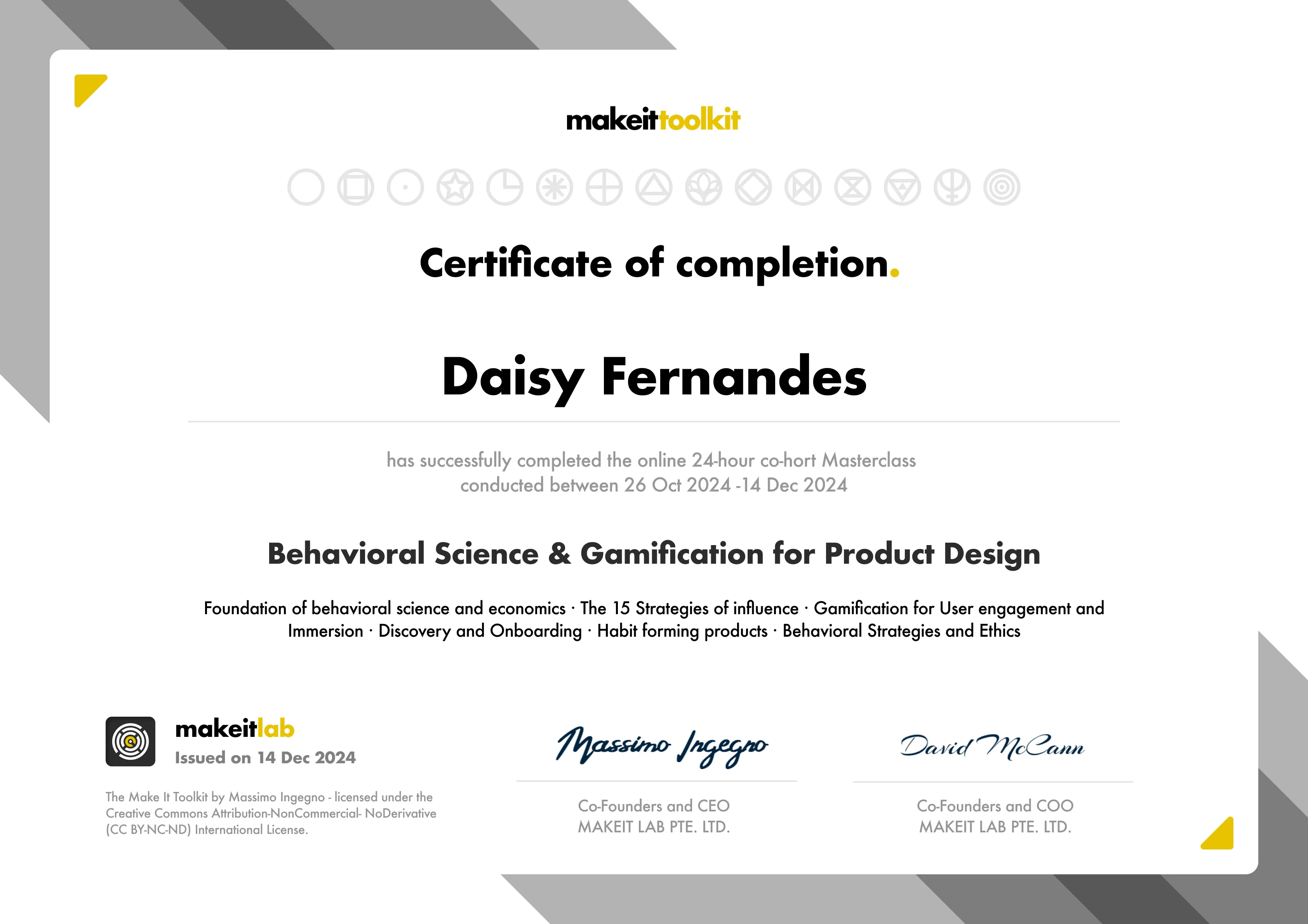 The Make it Masterclass is a 24-hour interactive learning program thought by leading educators and practitioners. It provides unique insights into the 5-step Behavioral Design & Gamification process and method to design more usable, persuasive and engaging digital experiences to change behavior and drive business growth, ethically.