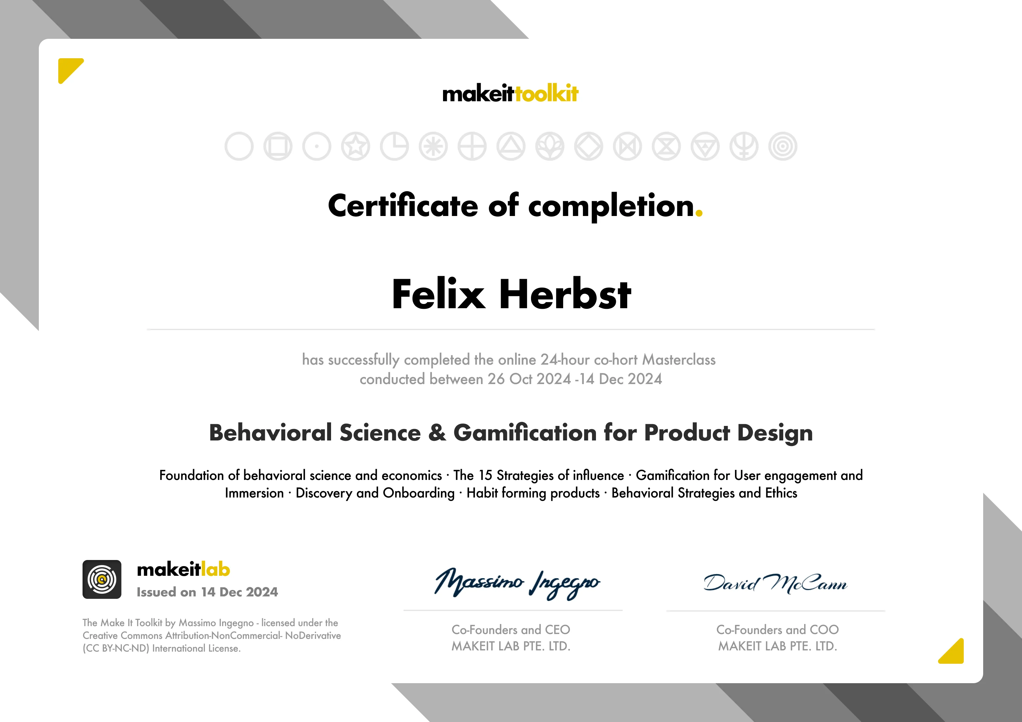 The Make it Masterclass is a 24-hour interactive learning program thought by leading educators and practitioners. It provides unique insights into the 5-step Behavioral Design & Gamification process and method to design more usable, persuasive and engaging digital experiences to change behavior and drive business growth, ethically.