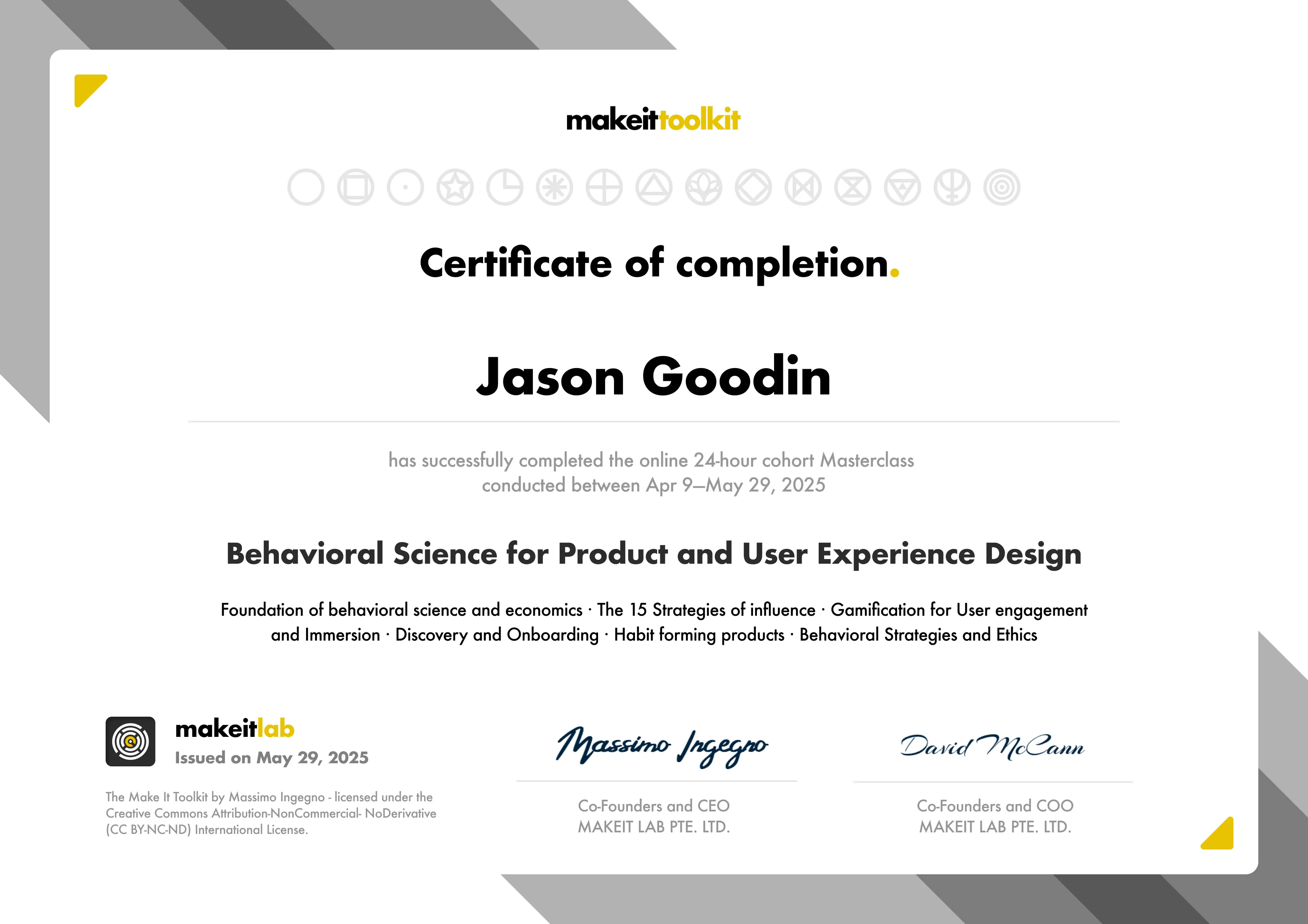 The Make it Masterclass is a 24-hour interactive learning program thought by leading educators and practitioners. It provides unique insights into the 5-step Behavioral Design & Gamification process and method to design more usable, persuasive and engaging digital experiences to change behavior and drive business growth, ethically.