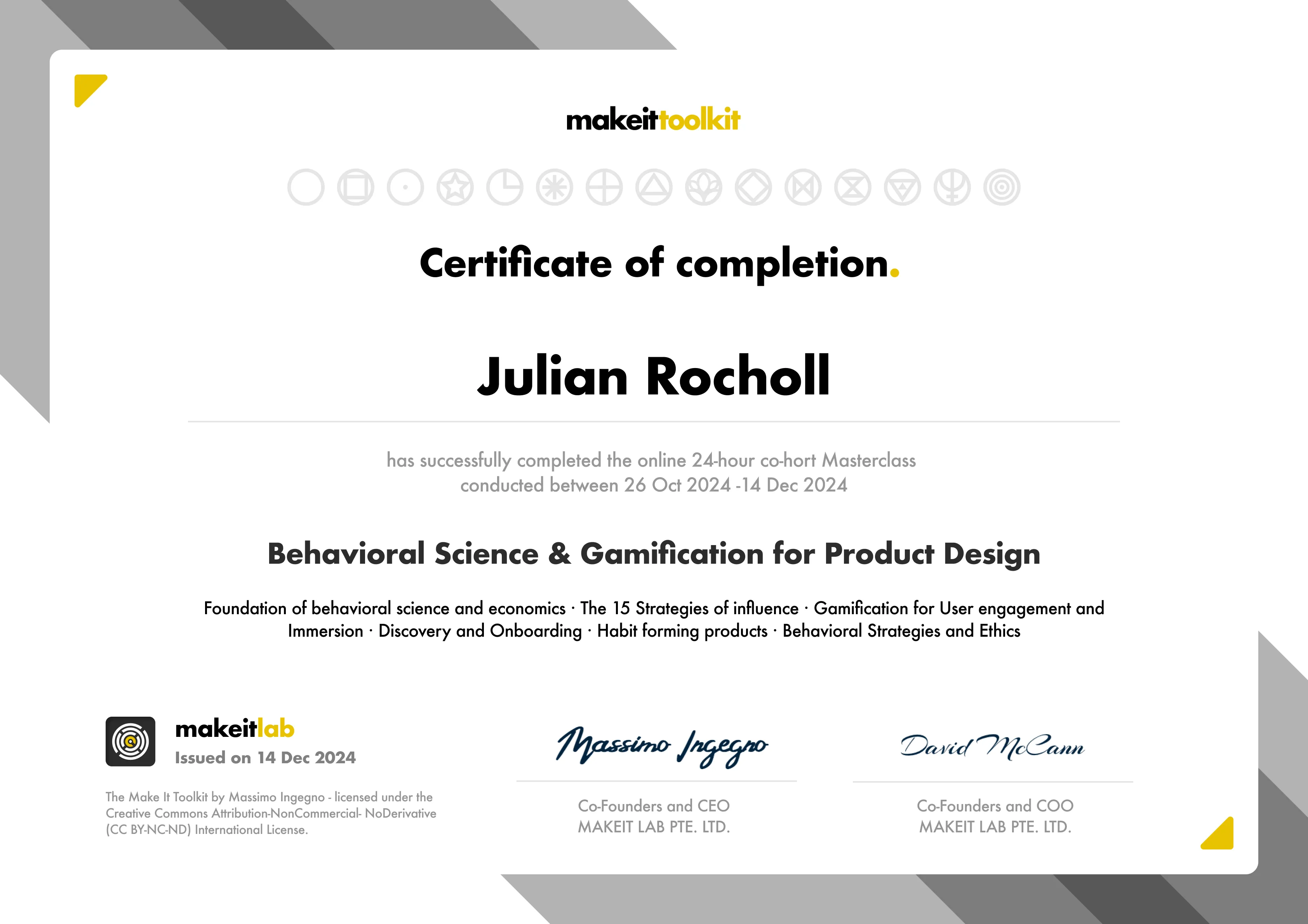 The Make it Masterclass is a 24-hour interactive learning program thought by leading educators and practitioners. It provides unique insights into the 5-step Behavioral Design & Gamification process and method to design more usable, persuasive and engaging digital experiences to change behavior and drive business growth, ethically.