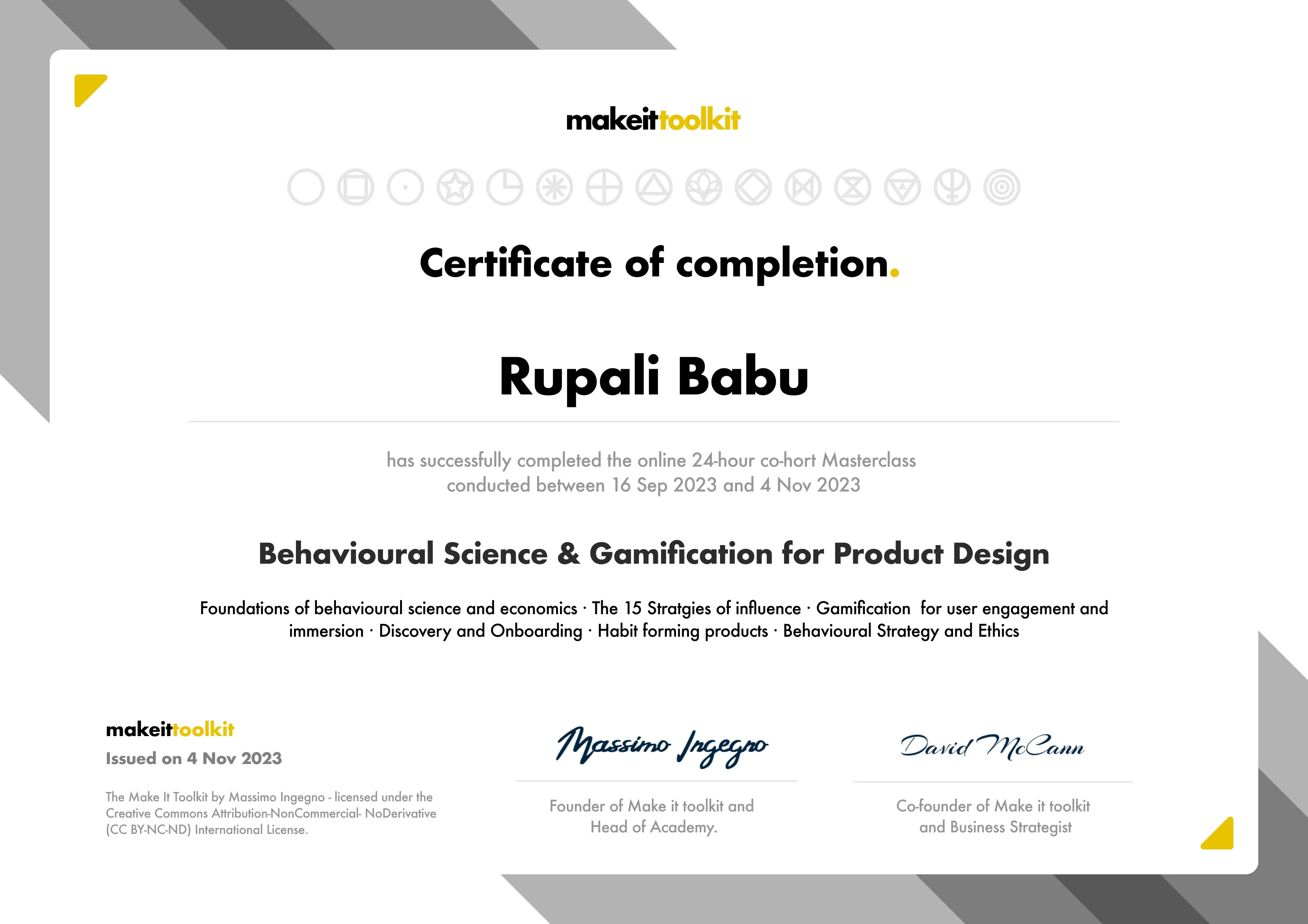 The Make it Masterclass is a 24-hour interactive learning program thought by leading educators and practitioners. It provides unique insights into the 5-step Behavioral Design & Gamification process and method to design more usable, persuasive and engaging digital experiences to change behavior and drive business growth, ethically.