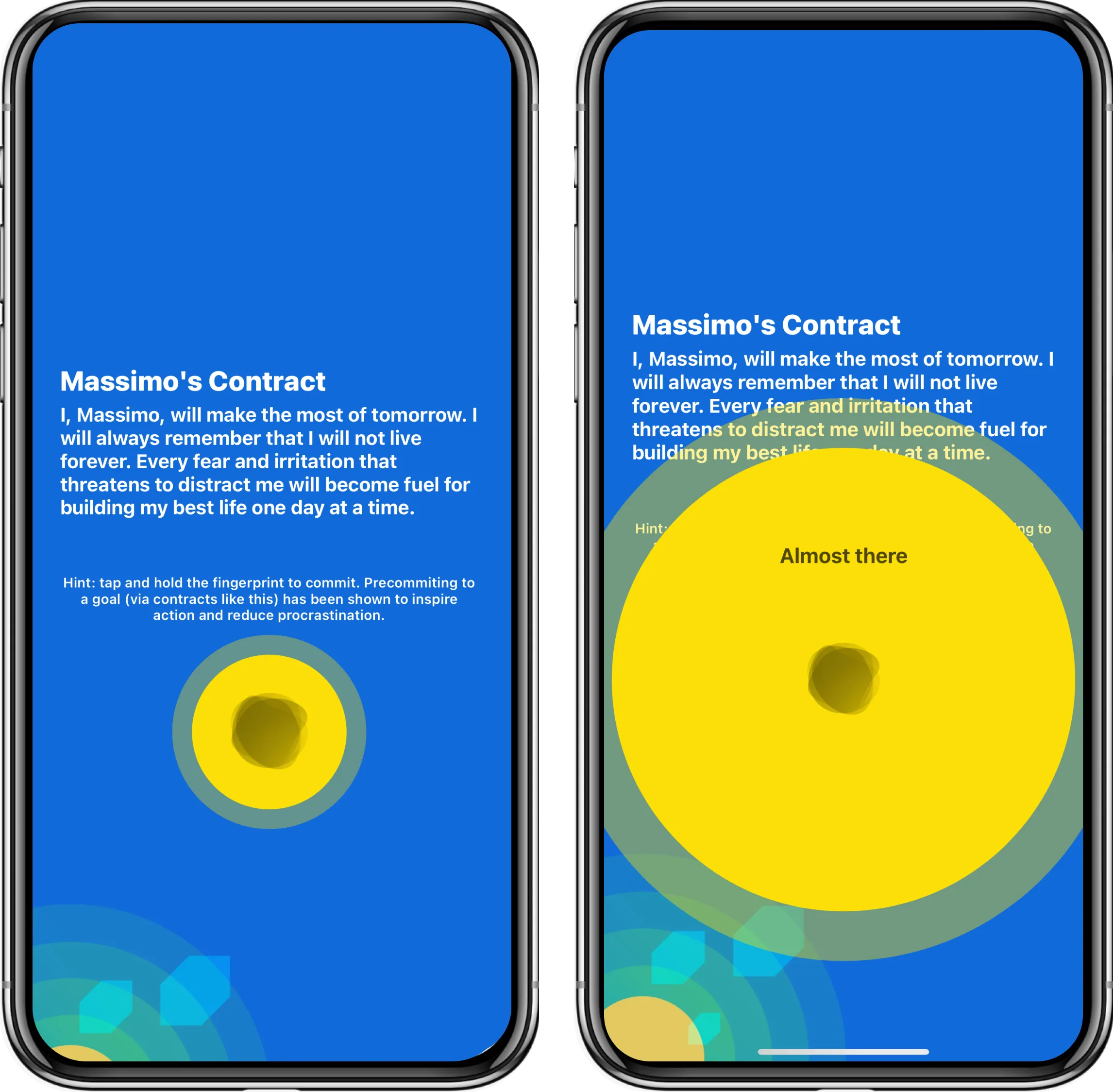 The daily planner and self-care habit tracking app Fabolous asks users to pre-commit to their goals by pressing and holding on a button that symbolises a personal contract.